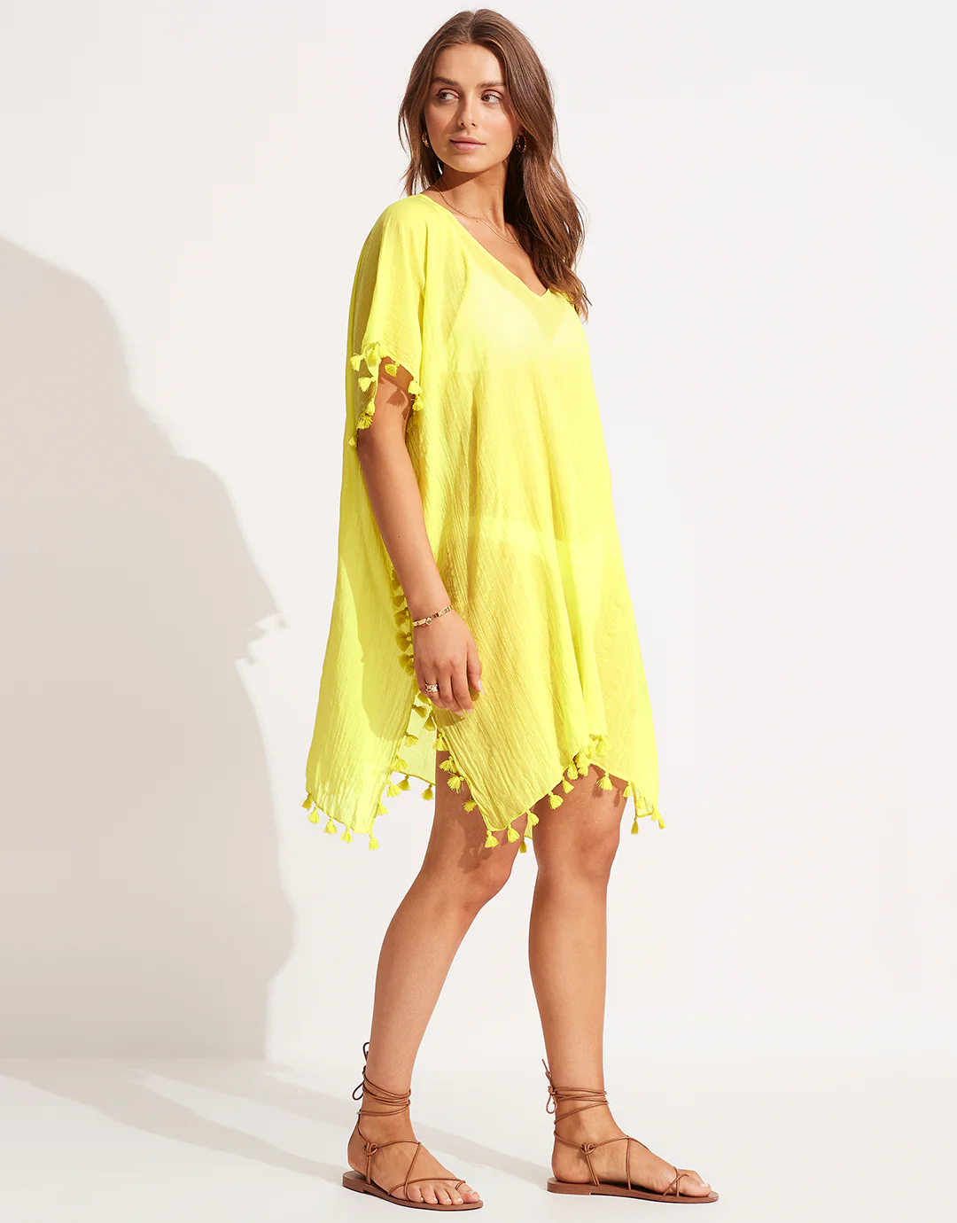 The bright yellow Amnesia Kaftan from Seafolly is a pretty pop of colour to throw over your Seafolly swimwear. Made from soft cotton gauze, with a V neck and tasselled hem.