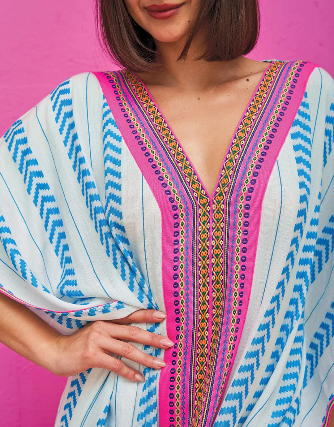 The Indian Thobe from Pitusa features a flattering deep v-neckline with Inca trim and loose sleeves. The drapey and delicate hand-loomed fabric from India feels ethereal and light, so much so that you will want to live in it! Available in Standard or Petite lengths. Choose Standard if you're over 5ft 4in and Petite if you're under.