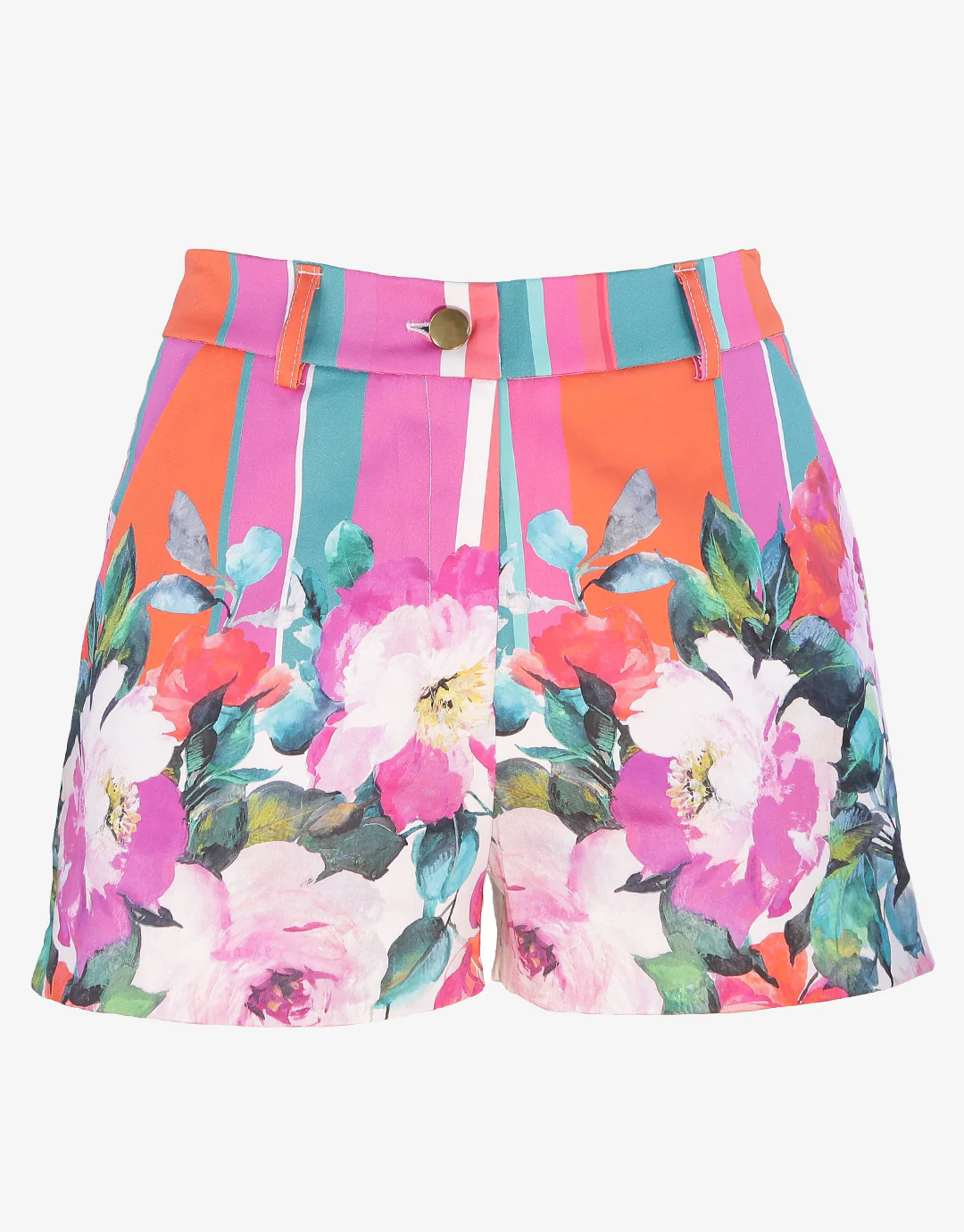 The beautiful Melania beach shorts from Roidal have the Melania floral print combined with a block stripe design in pink, red and turquoise. With a tailored waistband, button, zipper and pockets.
