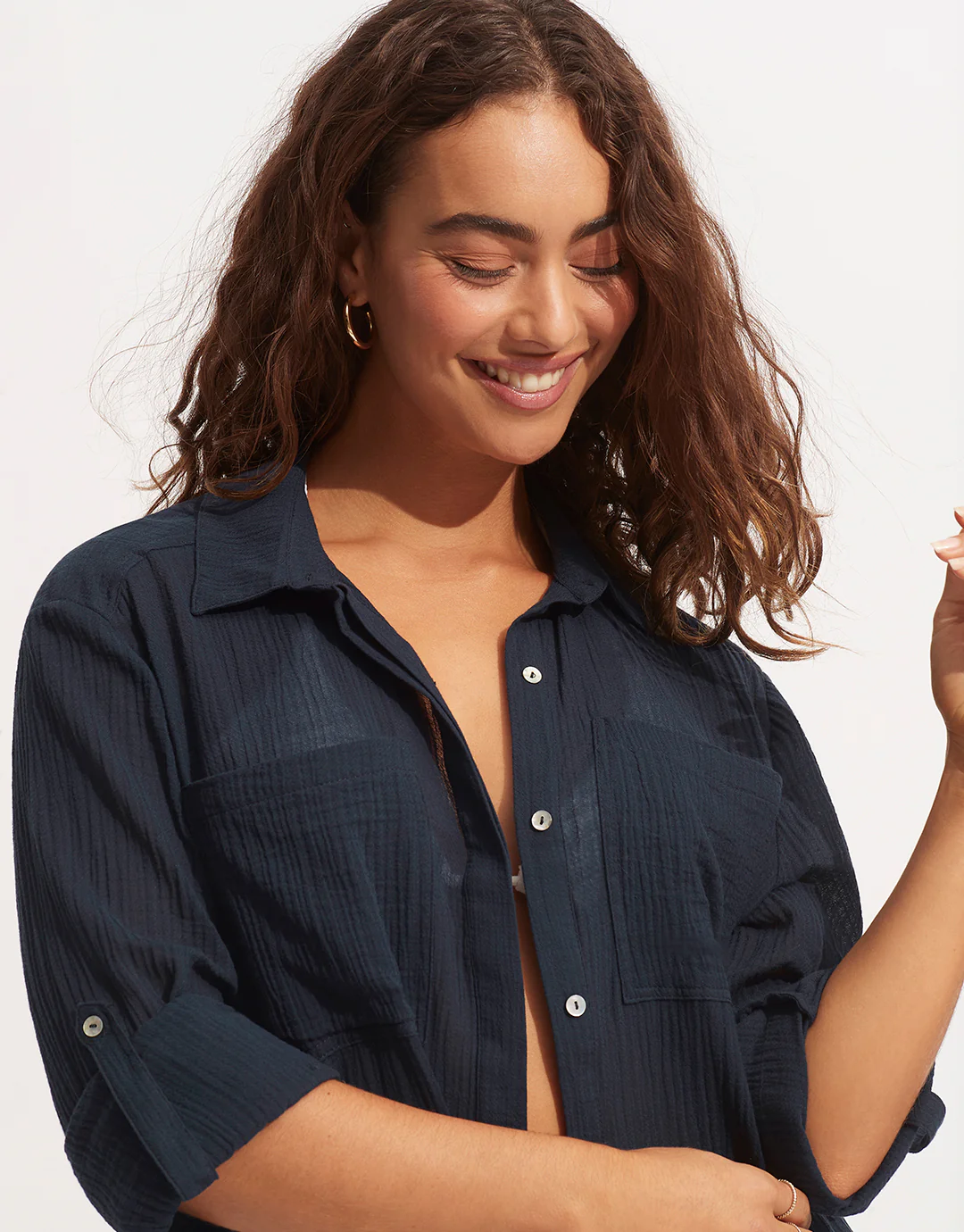 This Seafolly Crinkle Twill beach shirt is a great lightweight cover-up with high-low hemline, collared V neck, long sleeves which can be rolled and buttoned. This great easy to wear beach shirt can be worn open or buttoned and has pockets at the front.