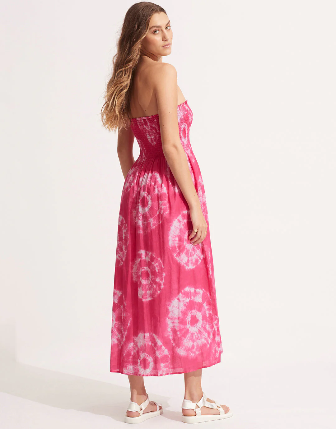 The Tie Dye Skirt Dress from Seafolly is a great versatile style, offering two looks in one garment. With a full skirt and a shirred bodice, this pretty pink tie-dye look style can be worn as a maxi skirt or over the bust as a bandeau midi dress,